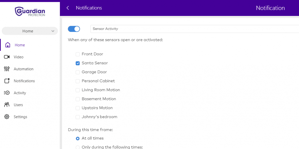 Did you know you can use your Guardian indoor security camera or an image sensor and a Santa suit to catch video clips of you — er, we mean Santa — delivering presents? Even if the footage only catches Santa’s boots, your kids will be excited to see that Santa really did show up while they were sleeping.